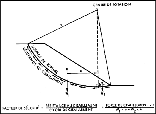 Au début du dix-neuvième siècle, un ingénieur français, Alexandre Collin, qui travaillait à la construction de canaux, remarqua que les surfaces de cassure formées par les glissements de terrains survenant dans l'argile le long des berges d'un canal adoptaient une forme incurvée semblable à celle qui est illustrée Figure 1. Il publia en 1846 un mémoire dans lequel il suggérait une méthode statique d'analyse basée sur une surface courbe et mesurait la résistance des sols au cisaillement. On a, depuis cette époque, proposé diverses méthodes d'analyse. Elles ont conduit à la méthode du cercle de glissement, mise au point par des ingénieurs suédois spécialisés dans les ports et sur laquelle reposent les techniques actuellement utilisées.