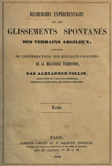 Selon Collin (1846), L'attention des constructeurs ne s'est pas de tout temps portée vers les glissements de terrain. Il parraît en effet que les premières observations positives ne remontent qu'à une époque assez rapprochée de nous. Sur la fin du 17e siècle, le Maréchal de Vauban, qui avait combattu des accidents de cette nature dans sa longue pratique des travaux de fortification, signale dans un mémoire de 1699 diverses circonstances relatives aux glissements des terrains argileux. Sur la fin du 18e siècle; Perronet, premier ingénieur des turciers et levées, s'occupa sérieusement de cette question. Plus tard, l'ingénieur Girard consigna dans un Mémoire des observations analogues. Selon Collin, la surface de glissement n'est jamais plane. Collin a été le premier ingénieur à mettre en doute l'hypothèse d'une surface de glissement planaire et à mettre en doute l'hypothèse de Rankine. Selon Collin: Pour fonder quelque chose durable, il faut faire table rase des erreurs, des notions fausses et des préjugées. Bacon a dit: que, si les notions mêmes qui sont comme base de l'édifice sont confuses et extraites des choses au hasard, tout ce qu'on bâtit sur un tel fondemnet ne peut avoir de solidité. Les méthodes confortement proposées pour par Collin pour les glissements de terrain étaient :