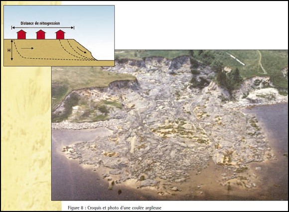 Dans les argiles non sensibles, un glissement de terrain se traduit sous forme d'une masse instable (glissement simple) glissant sur une surface de glissement avec le résultat que la masse instable devient au repos au niveau du pied du talus, sans aller plus loin. Autrement dit, les débris de glissement de terrain agissent comme une butée stabilisatrice pour la nouvelle géométrie des terrains en place. Pour les argiles sensibles, le mécanisme de glissement est très différent. Dans ce cas à cause de la sensibilité élevée de l'argile, le premier glissement survenu cause le remaniement de l'argile à l'arrière du glissement survenu, ce qui cause des nouveaux glissements avec la formation d'une coulée argileuse (argile liquéfiée) et une série de glissements rétrogressifs. Ainsi dans le cas des argiles sensibles, le géotechnicien ne doit pas s'intéresser seulement à la formation du premier glissement, mais il doit également analyser l'étendue de la zone qui sera affectée par la coulée argileuse du glissement rétrogressif si l'argile en place est sensible. La présence d'une argile sensible est reliée: